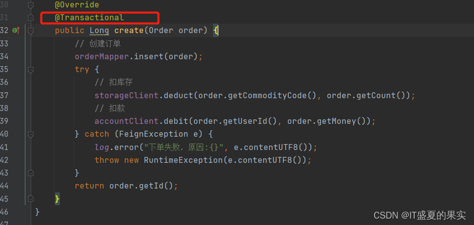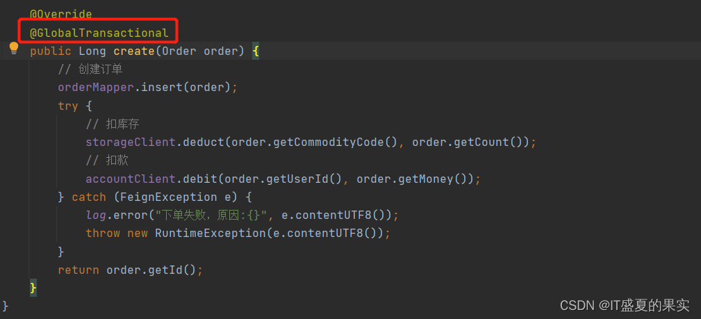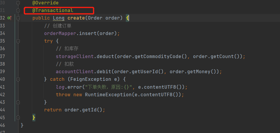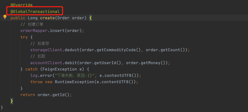 4)标记事务的范围(就是在所在 的方法上加上@GlobalTransactional注解)