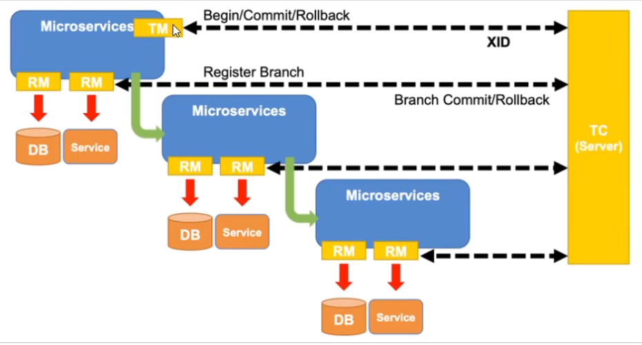 RM-资源管理器:管理分支事务处的资源,与TC交谈以注册分支事务和报告分支事务的状态,并驱动分支事务提交和回滚