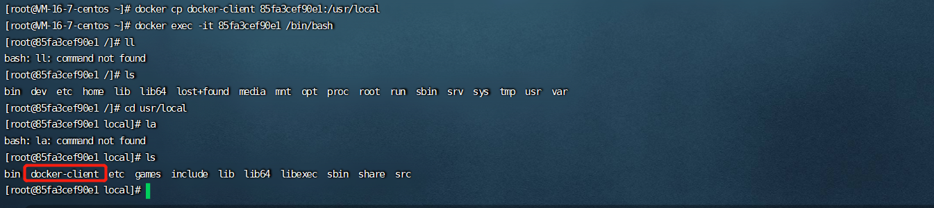例如:docker cp docker-client 85fa3cef90e1:/usr/local