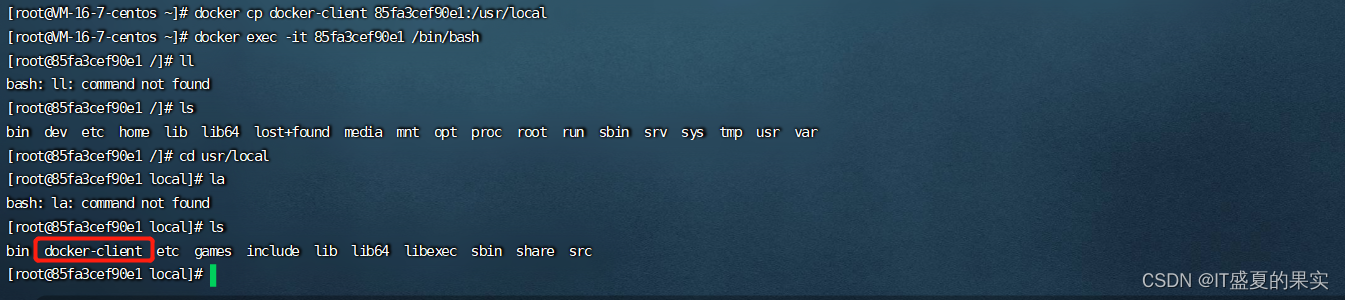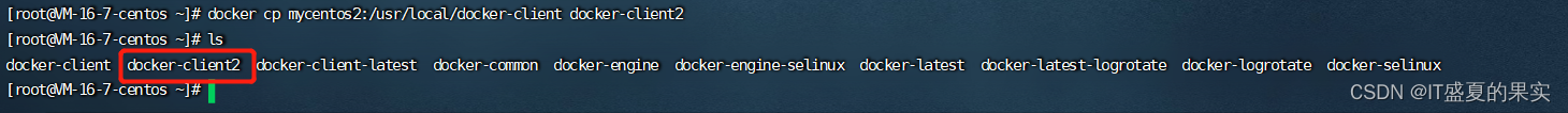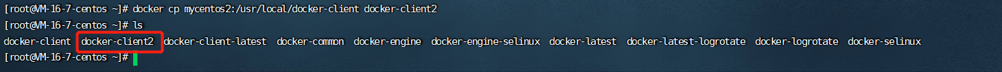 例如: docker cp mycentos2:/usr/local/docker-client docker-client2