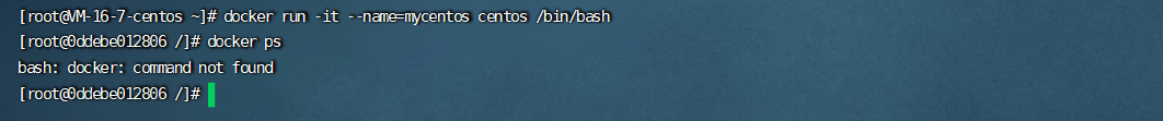 原因是:这种方式相当于在宿主机的centos上运行了一个centos的容器,而在这个容器中没有docker,所有不能运行相关的命令了。