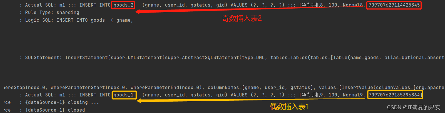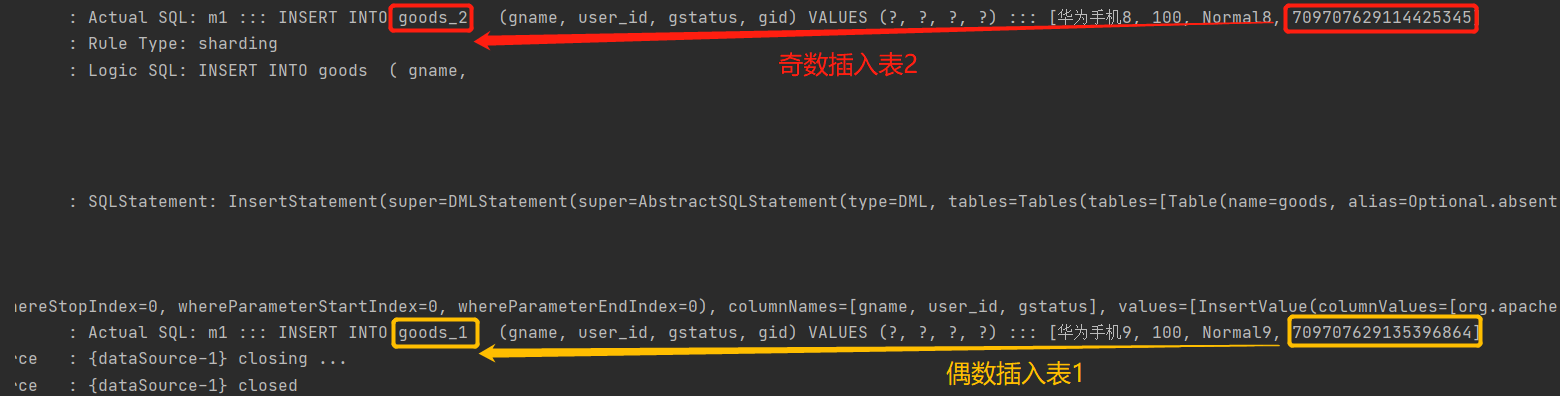 2022-03-13 11:37:18.578 INFO 15468 --- [ main] ShardingSphere-SQL : Actual SQL: m2 ::: SELECT gid,gname,user_id,gstatus FROM goods_2