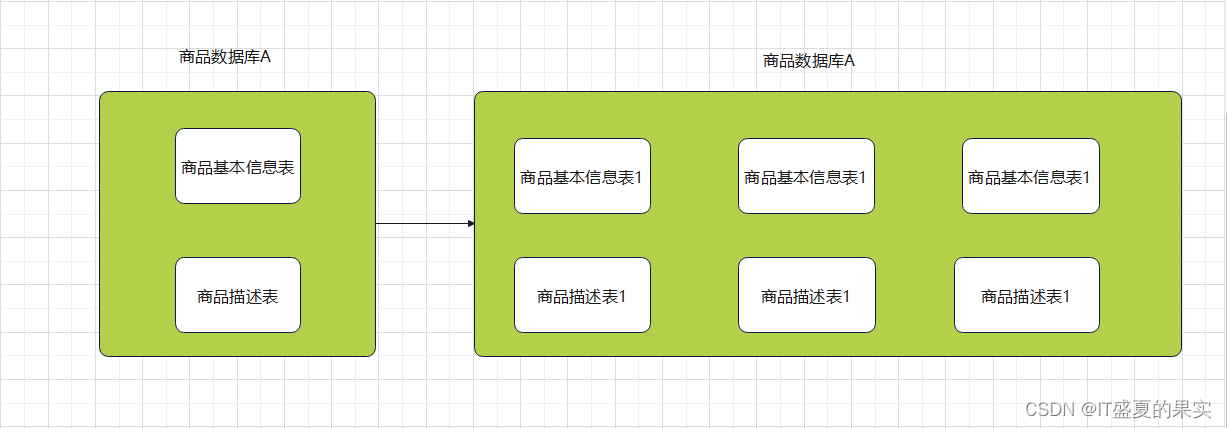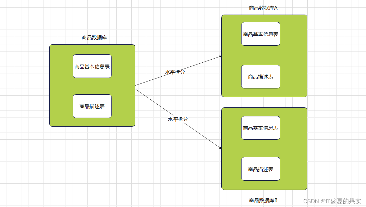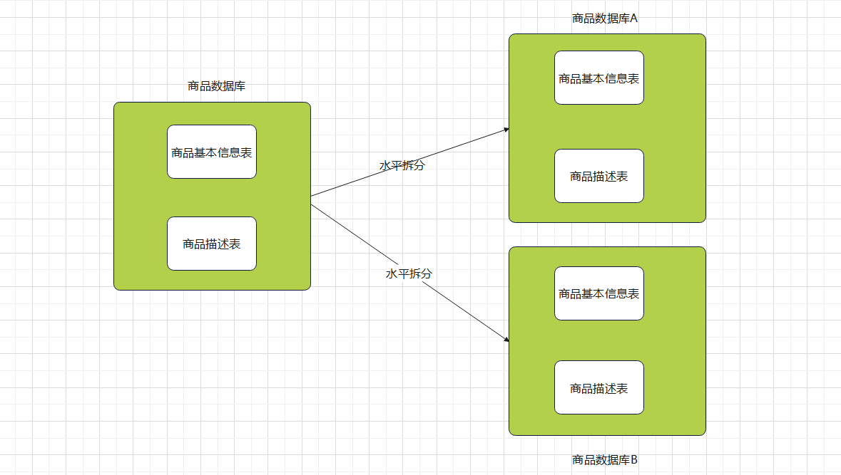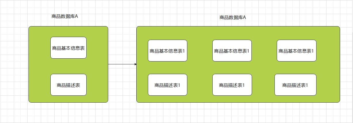 产生场景:就拿刚刚的商品来说,已经经过了水平垂直切分,但是数据量过大的原因依然没有得到妥善的解决。于是可以将我们分好的库拆分成多个相同结构的,如下图所示: