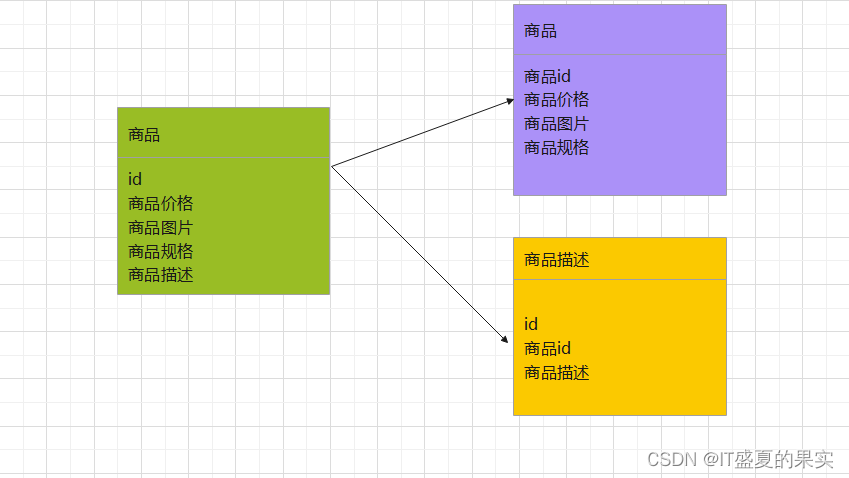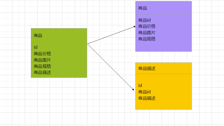 当我们在网上浏览商品的时候,就拿手机而言,它肯定包含许多属性,像一些:价格,图片、型号、参数、以及商品的描述什么的。但是用户在初步浏览时,不需要过多的关注它的一些商品细节,只需要观察,手机的价格以及外观是否感兴趣,如果感兴趣的话才会点击商品观察商品的一些参数以及商品描述什么的。而且对于这些商品参数,商品描述之类的属性,它们的访问频率较低,而且占用空间比较大,访问时间肯定相对较长。