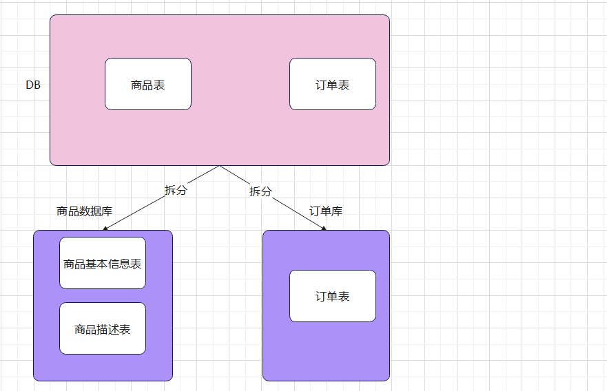 假如购买手机,点击手机进入详情页,然后付款之后会生成一笔订单 ,肯定也会有一张订单表。那么这个时候商品表和订单表都在一个数据库里面。于是可以将不同业务的表放到不同的业务库中,每个库放在不同的服务器上面,这样在进行数据库操作时,做到专库专用,减少数据库压力。