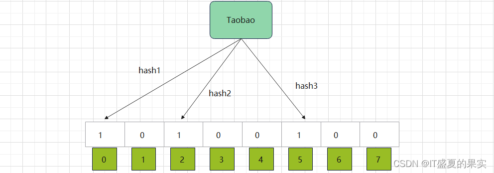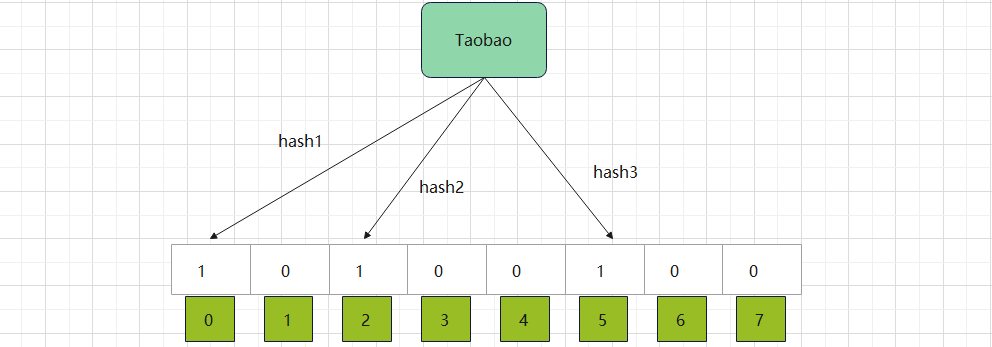 如果我们要映射一个值到布隆过滤器中,我们需要使用多个不同的哈希函数生成多个hash值、并对每个生成的hash值指向bit位置1,例如针对“Taobao”和3个不同的hash函数分别生成了3个hash值分别对应在位图下标第0,1,5的位置,用下图表示为: