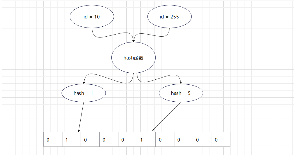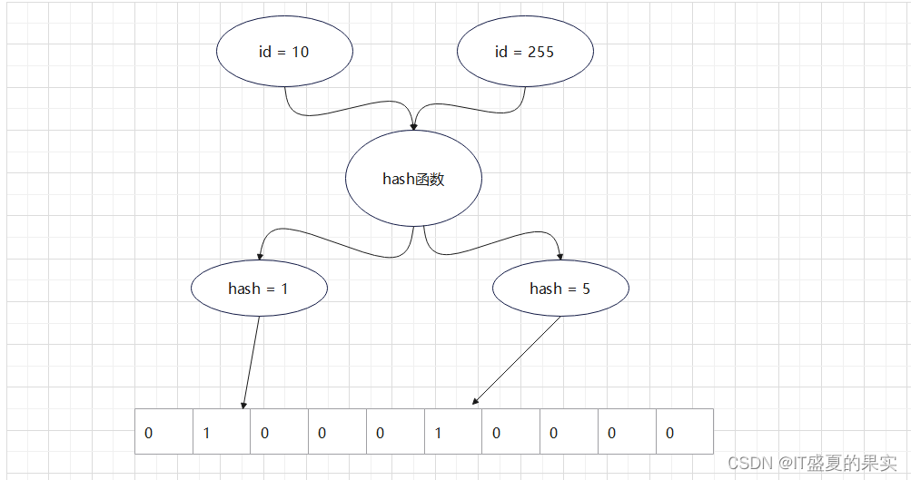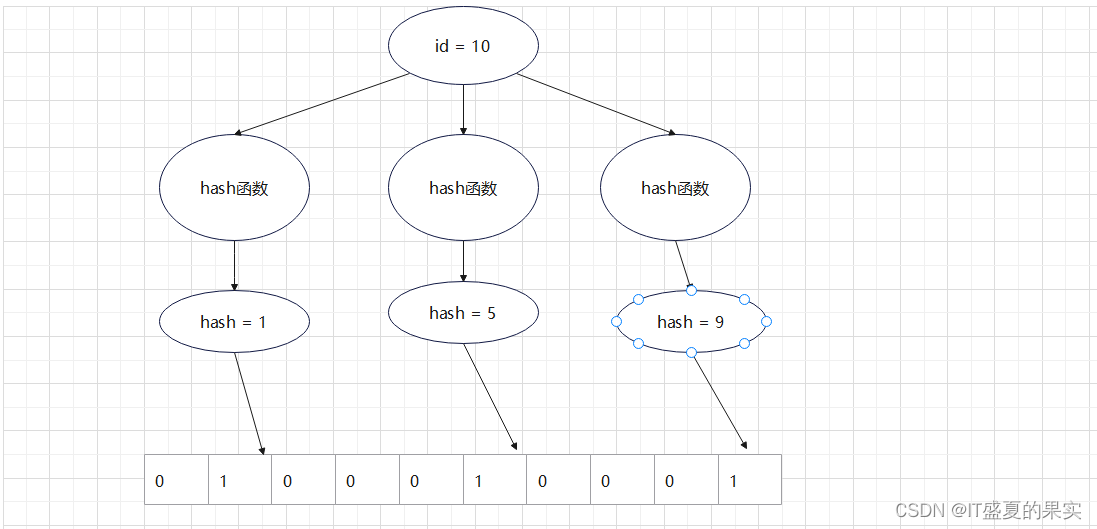 例如:当我们用id = 10时进行数据访问,此时经过hash算法算出hash值为1,就会在bit数组中下标为1的位置来标识数据 ,此时发现在下标为1的地方是有数据的,就将数据返回。(id = 255访问时也是如此)。但刚刚也讨论过,这个是有可能发生hash碰撞的。但是hash碰撞是不可避免的,只能减少hash碰撞的概率。减少hash碰撞的概率方式有两种一是加大数组的长度,二是增大hash函数的个数。假如id = 10这条数据经过3次hash计算,然后在位图上确定了3个位置。那么假如再来一个id = 166的数据,也计算它的3次hash值,然后在位图上确定了3个位置。那么它们通过第一次hash函数计算出来的结果可能相同,第二次通过hash函数计算出来的结果相同的概率就非常小了,第三次通过hash函数计算出来的结果要是还相同的话那概率真的是极低极低了。