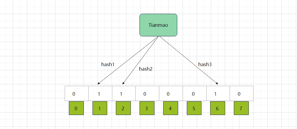 这只是存储了一个值,那么现在再存储一个值呢?比如再存储一个”Tianmao“值。”Tianmao“值也经过3个不同的hash函数生成了3个hash值对应在位图下标第1,2,6位置,用下图表示为: