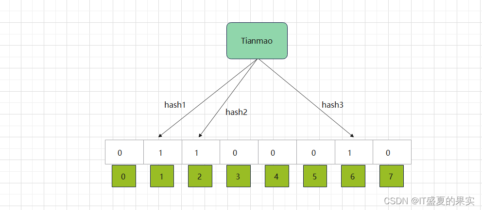 答案:不一定存在。因为hash碰撞的原因,hash值有可能重合。就拿上面两张图来说下标为2所对应的bit位上的值重合了。所以当你查询”Tianmao“的时候,发现3个bit位上的值都是1。有可能是其他的值填充的。所以当表名结果显示存在,不一定存在。
