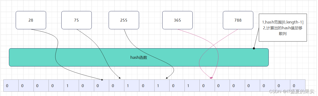 上图可以简要概括我们的布隆过滤器,数值经过hash函数计算出结果将数据映射到位图结构中。但是不同的数值计算有可能产生相同的hash值 (如图中红色的线表示),这种行为叫做hash冲突或者hash碰撞。