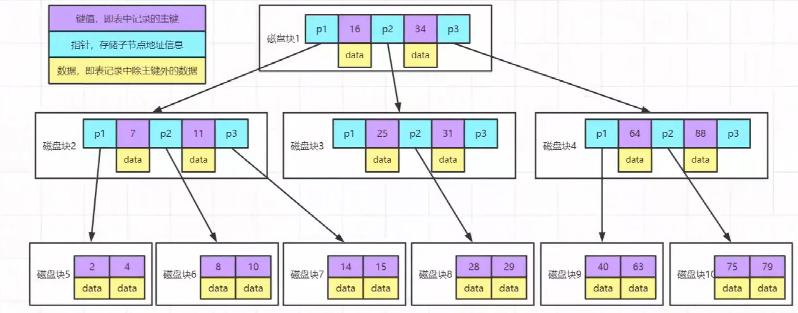 那磁盘块1举例:16,34表示具体的key值,data表示行数据,p1,p2,p3表示实际的指针。