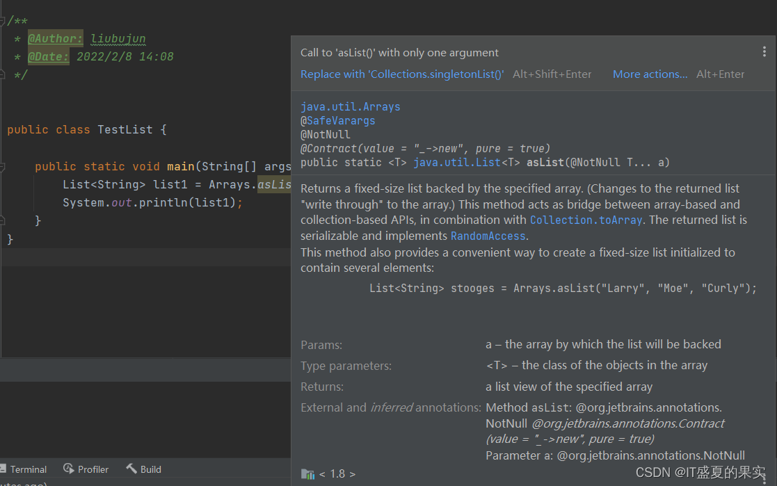 有时候在平时开发中,编译代码常常会发出警告,今天好奇就点进去了看了下,发现idea建议我们用Collections.singletonList(o) 代替 Arrays.asList(o)。