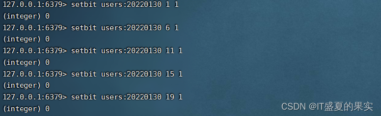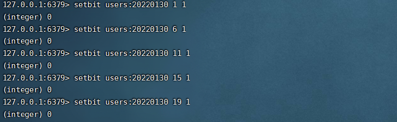 将key为users:20220130中偏移量分别为:1,6、11、15、19的值分别设置为1