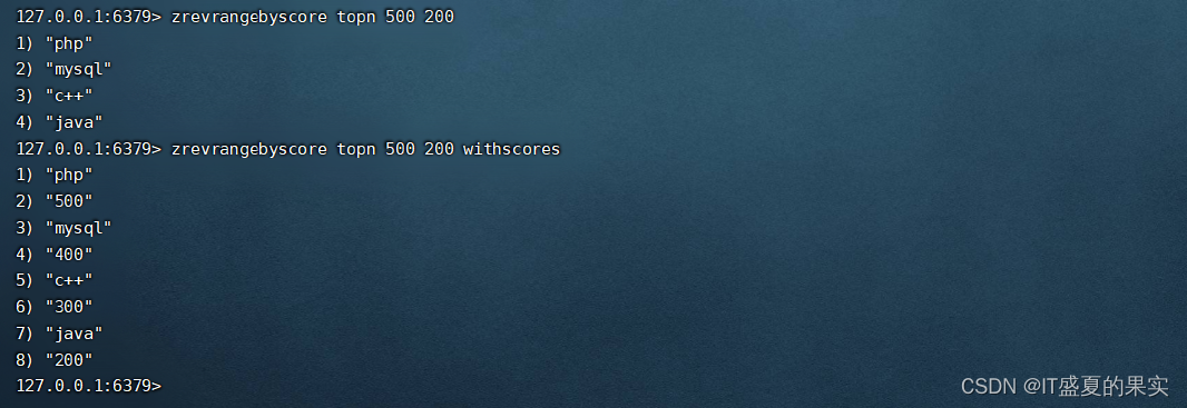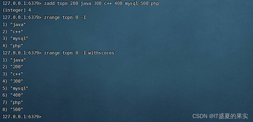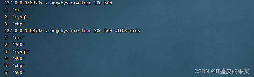 zrange<key> <start><stop> [withscores] 返回有序集合key中,下标在<start><stop>之间的元素,带withscores,可以让分数和值一起返回到结果集