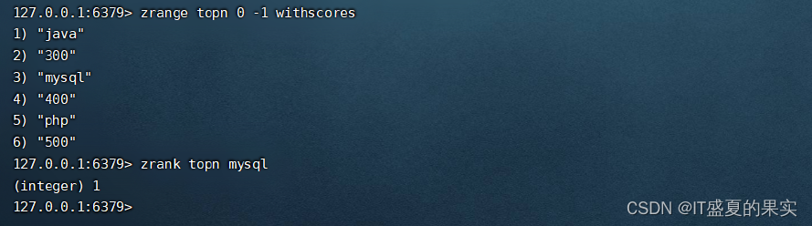 zrank<key><value>返回该值在集合中的排名,从0开始