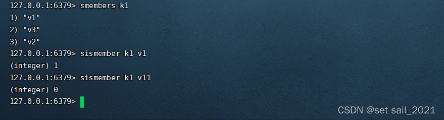 sismember <key> <value> 判断集合<key> 是否为含有该<value>值,有值则为1,无值则为0
