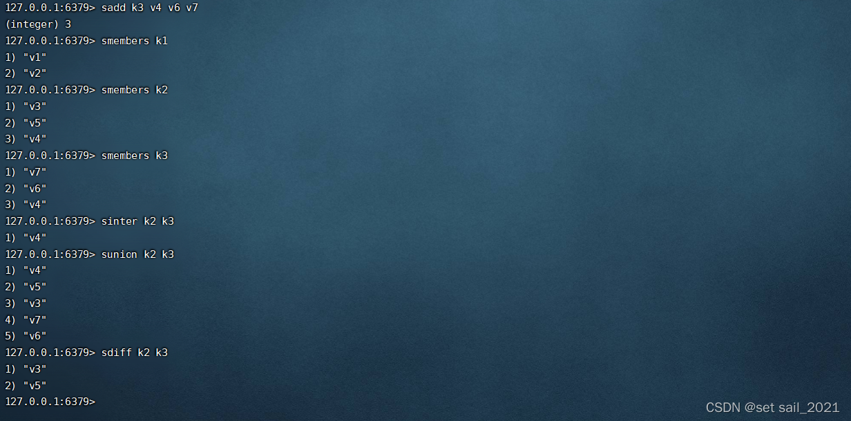 sdiff <key1> <key2> 返回两个集合的差集元素(key1中的,不包含key2中的)