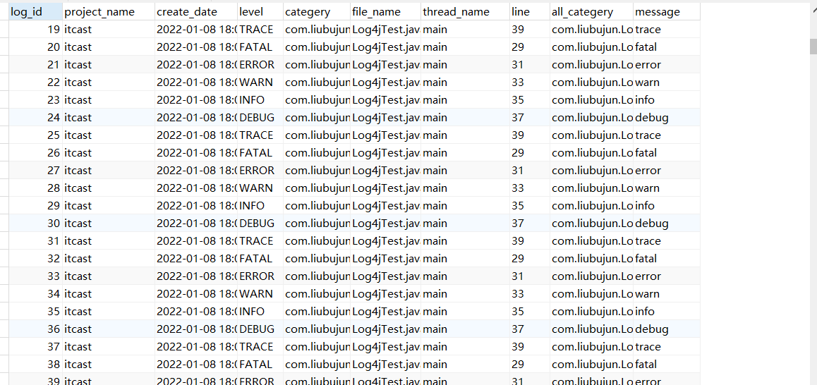 log4j.appender.logDB.Sql = INSERT INTO log(project_name, create_date, level, categery, file_name, thread_name, line, all_categery, message) values ('itcast', '%d{yyyy-MM-dd HH:mm:ss}', '%p', '%c', '%F', '%t', '%L', '%l', '%m')