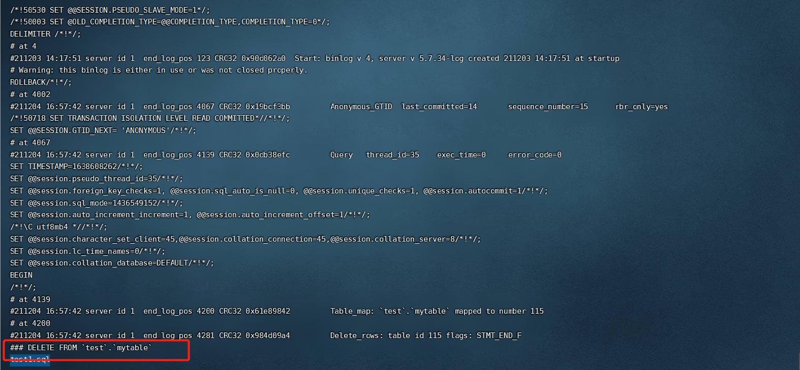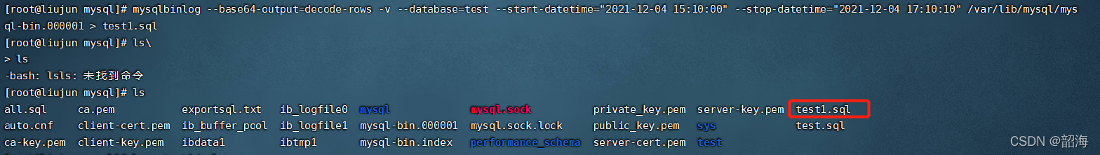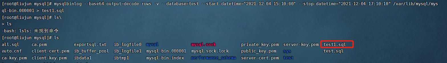 mysqlbinlog --base64-output=decode-rows -v --database=test --start-datetime="2021-12-04 16:50:00" --stop-datetime="2021-12-04 17:10:10" /var/lib/mysql/mysql-bin.000001 > test1.sql