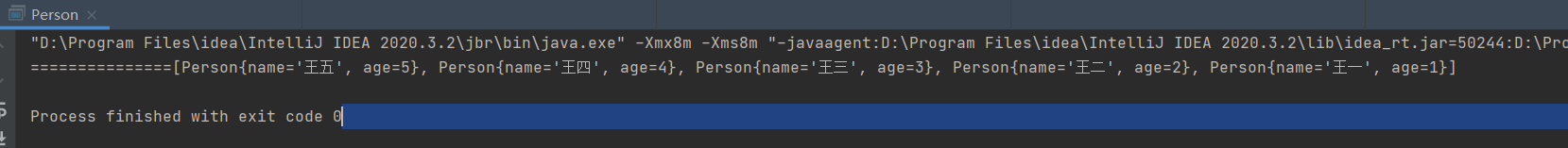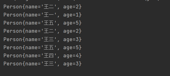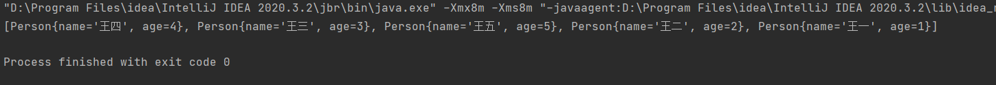 //正序:[Person{name='王一', age=1}, Person{name='王二', age=2}, Person{name='王三', age=3}, Person{name='王四', age=4}, Person{name='王五', age=5}]