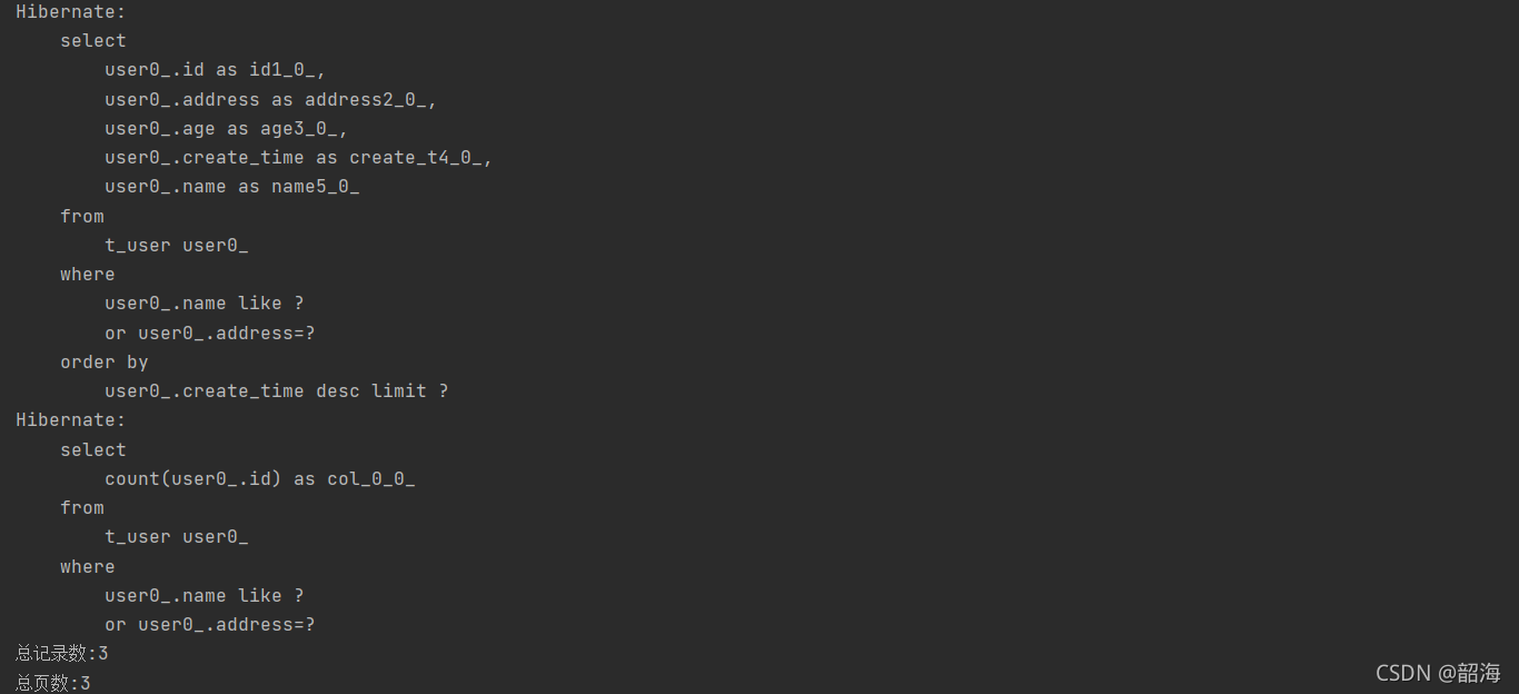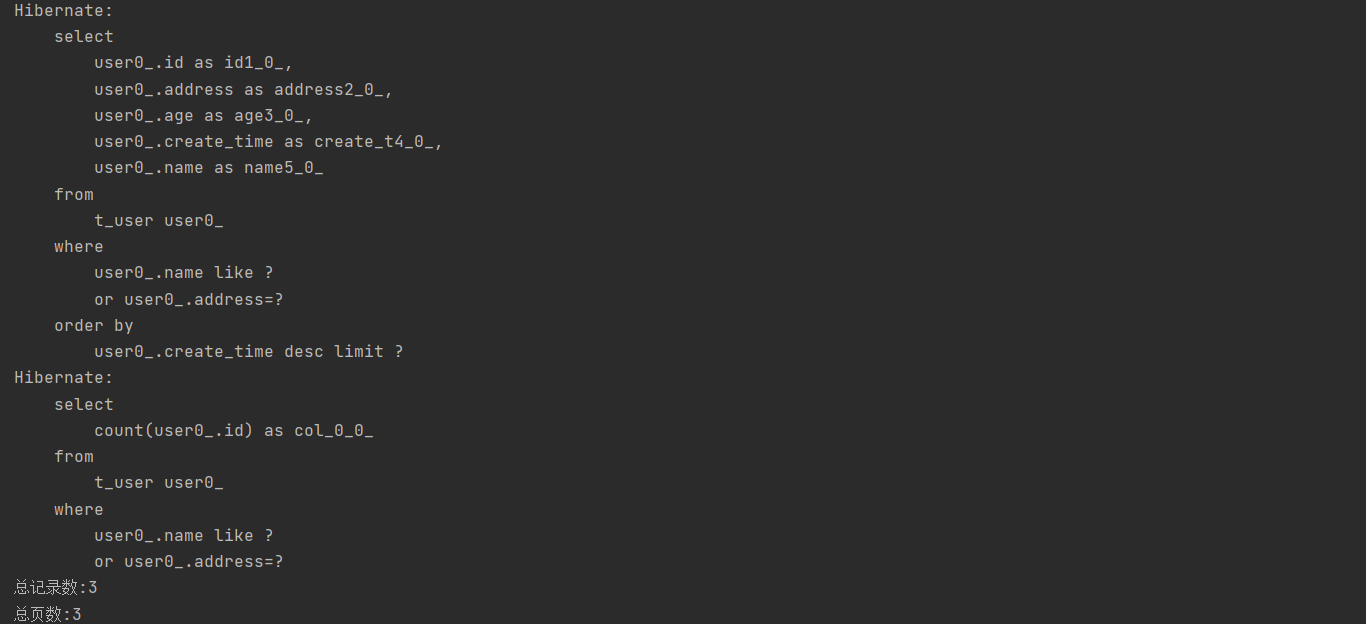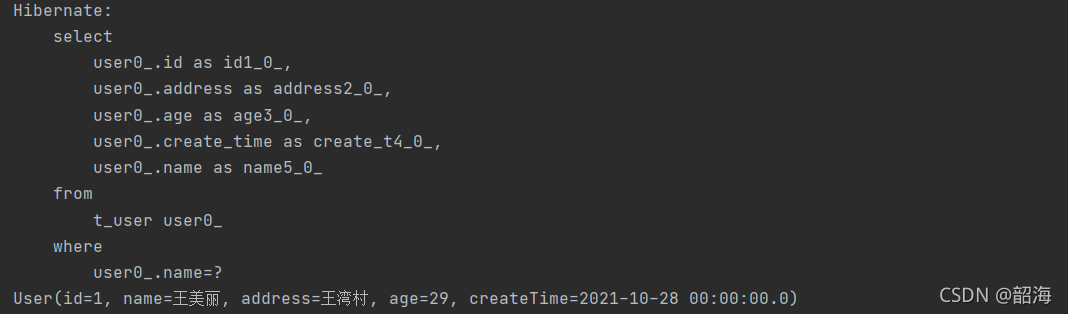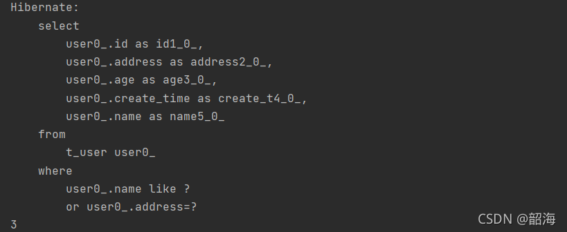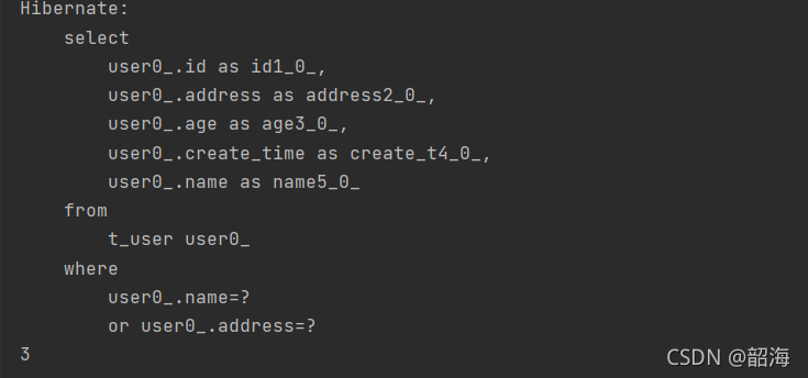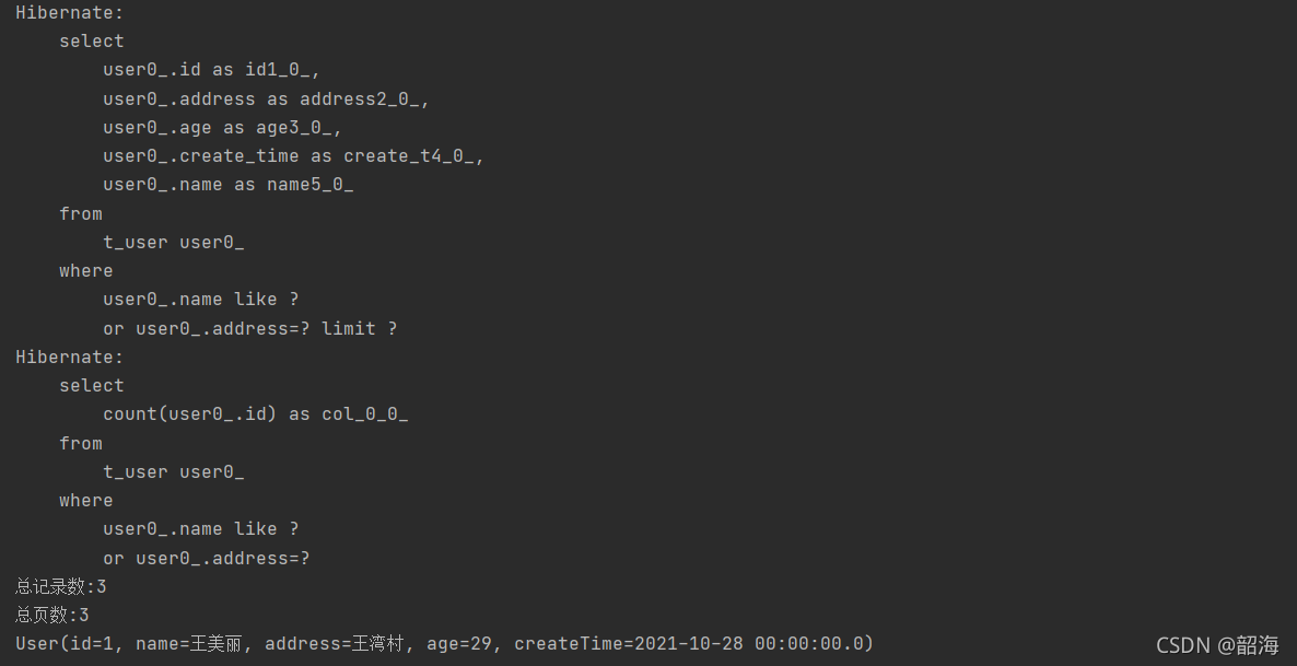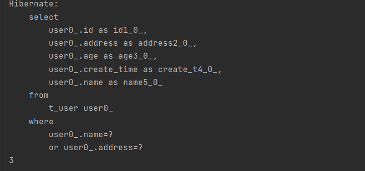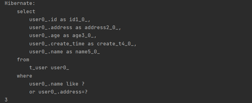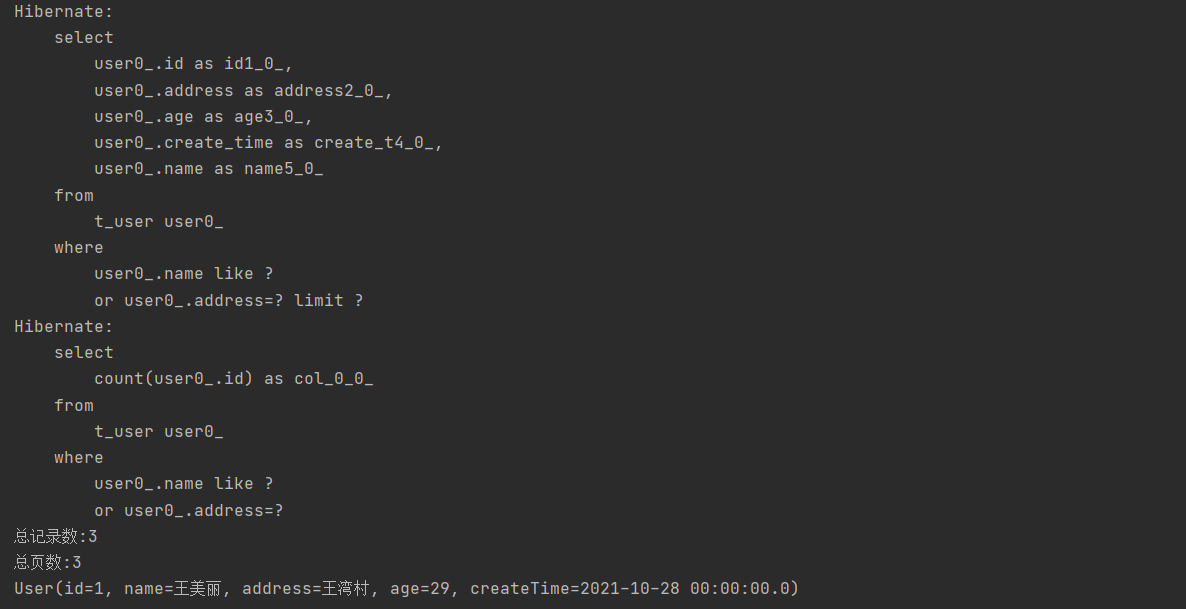 * @return select * from t_user where name = "王美丽" or address = "地球村"