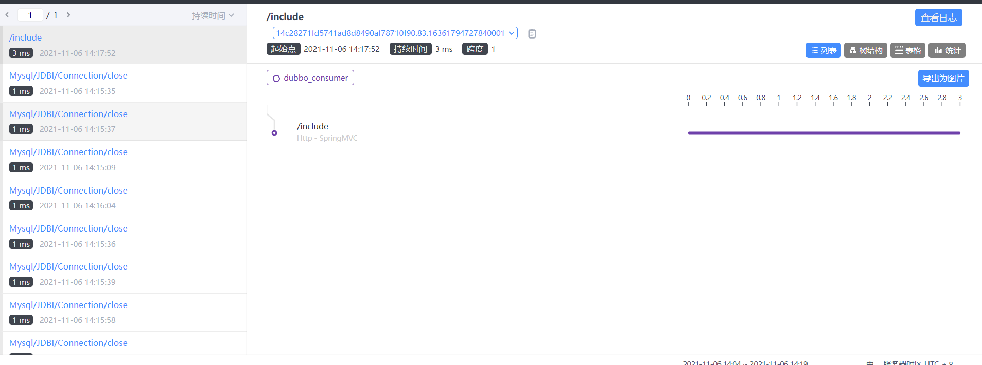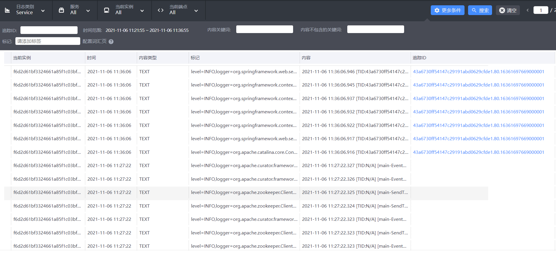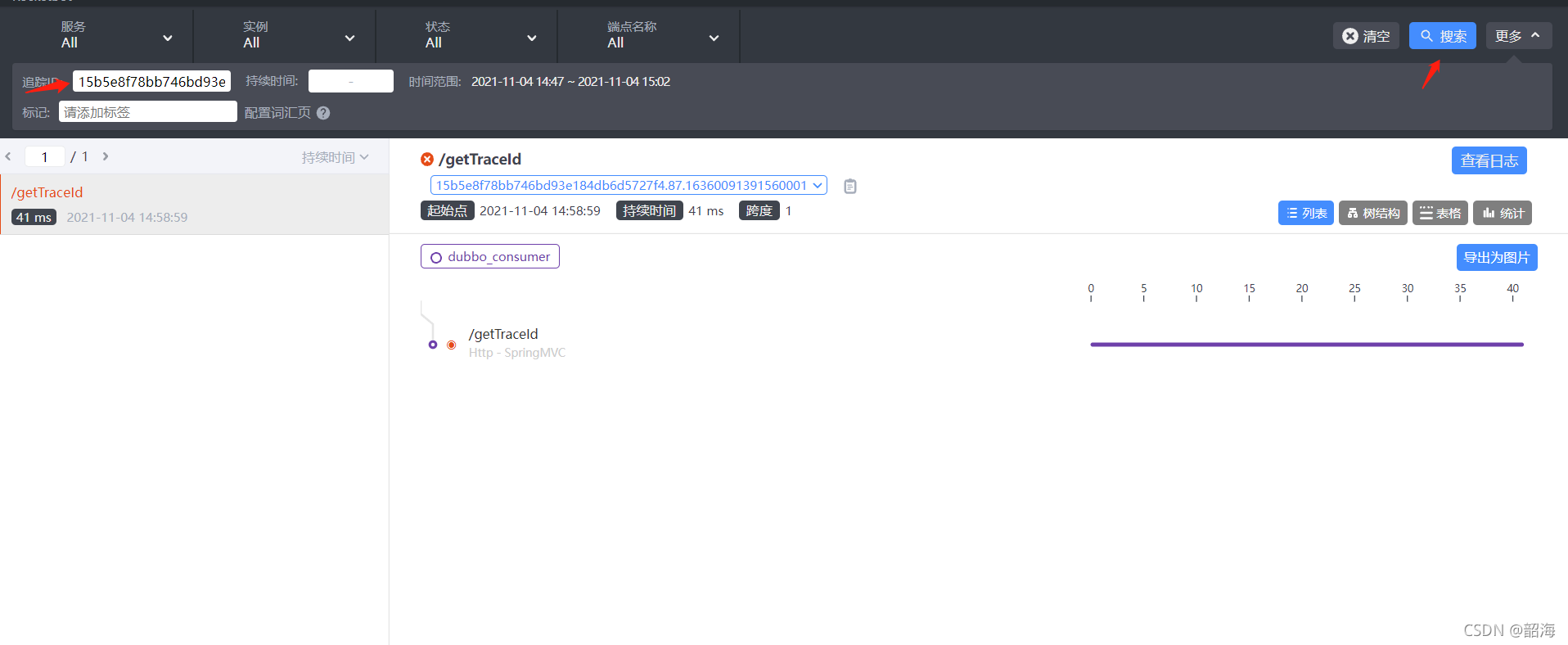 然后我们拿到tranceId在追踪中去搜索,可以很精确的匹配到我们的服务节点,并且可以观察他的调用日志。