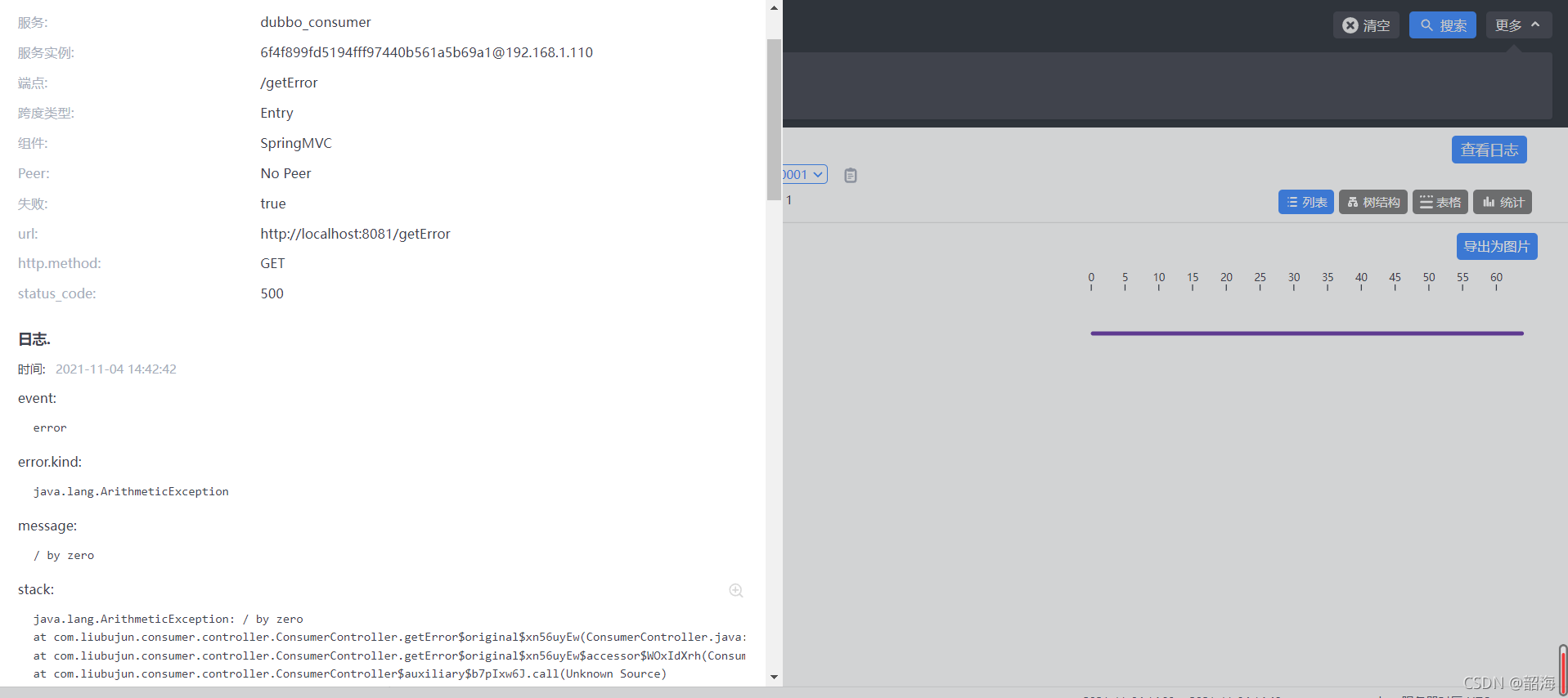 在追踪中我们同样也可以看到更加详细的信息,并且如果接口报错。可以看到报错日志。我们访问localhost:8081/