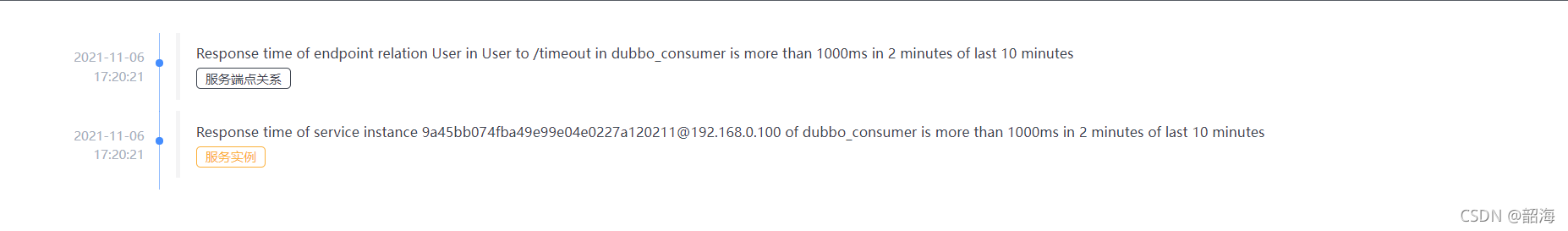然后为了方便,我们就来模拟服务调用超时告警。我们根据其默认规则中的超时告警规则,在过去的十分钟内超过3此调用超时1s钟。