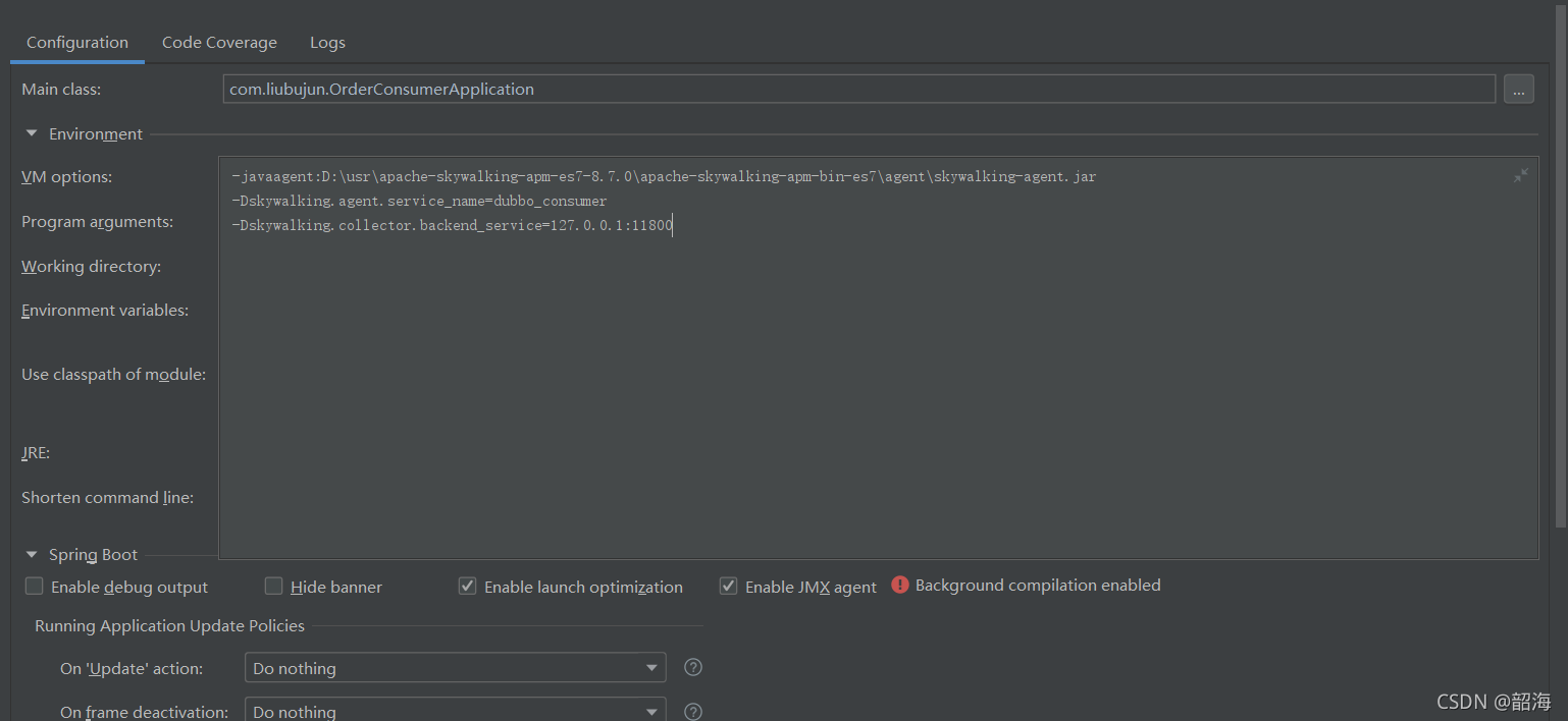 注意:此处为-Dskywalking.agent.service_name而不是-Dskywalking.agent.server_name(我已踩坑)。