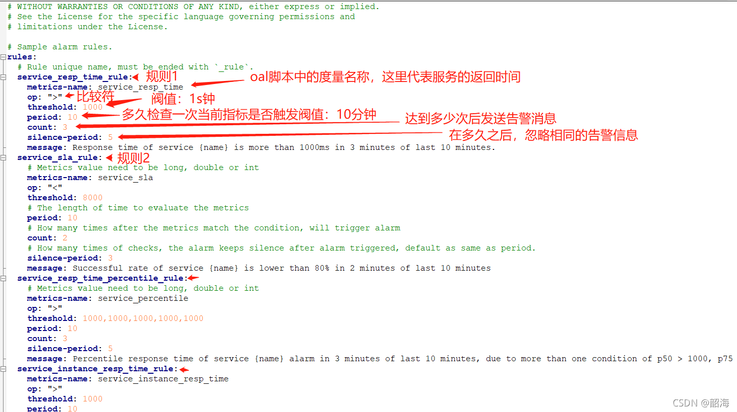 我们打开alarm-settings.yml文件发现其中有许多默认的告警规则,我们选择其中一条服务响应超时时间来看下: