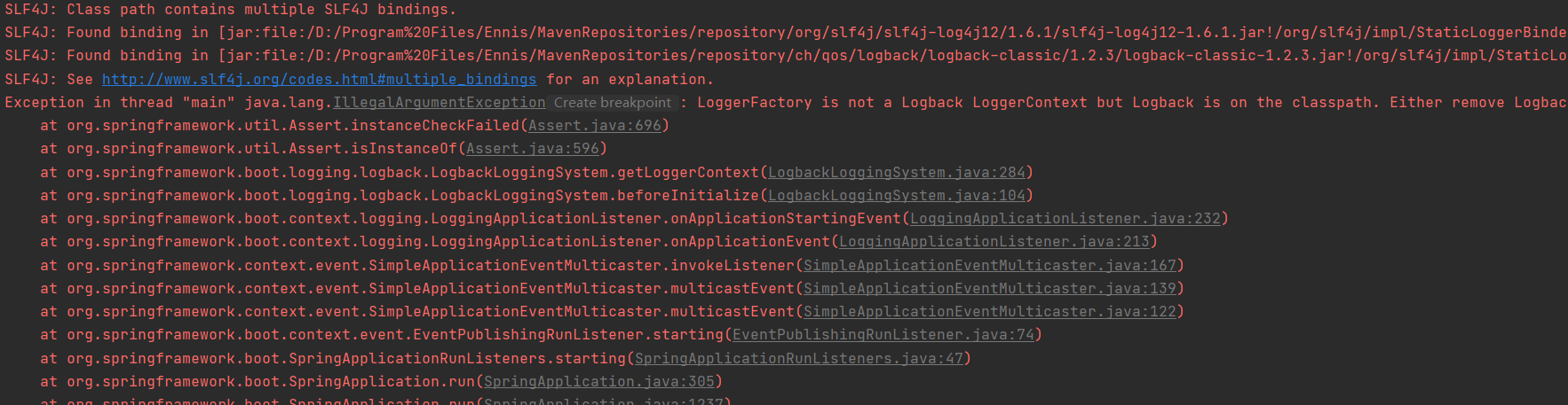 SLF4J: Found binding in [jar:file:/D:/Program%20Files/Ennis/MavenRepositories/repository/ch/qos/logback/logback-classic/1.2.3/logback-classic-1.2.3.jar!/org/slf4j/impl/StaticLoggerBinder.class]