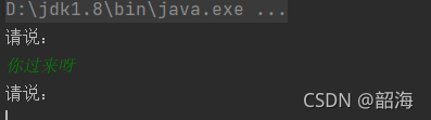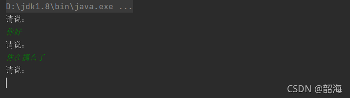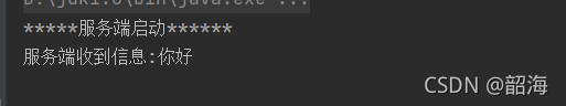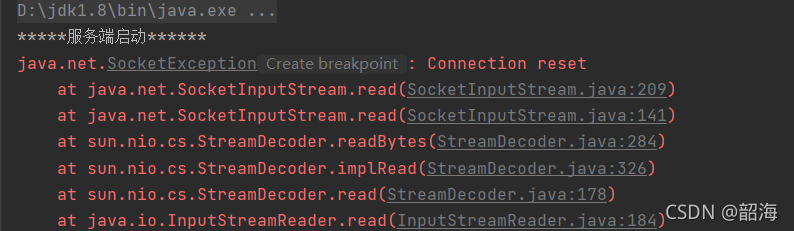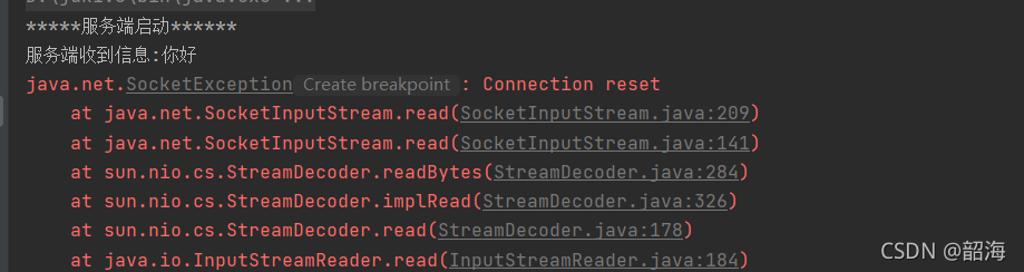 此时,服务端接收到客户端发送的一行数据,但是还是进入了连接重置的状态,这是为什么呢?因为我们的服务端接收到消息之后,我们的while判断依然会继续等待,但我们的客户端只发送一次,发送完之后就挂机了。而服务端监听到客户端挂机,就会抛出异常。我们可对服务端代码进行改进。