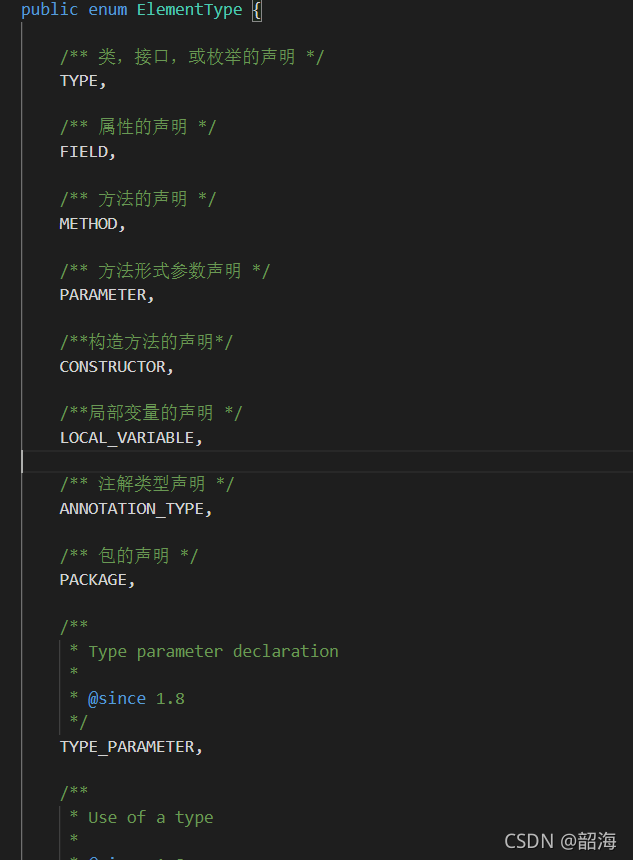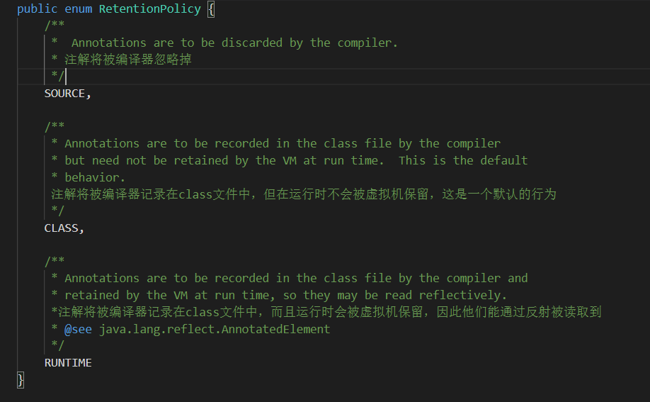 RetentionPolicy.SOURCE:如果一个注解被定义为这种类型,则他被限定在源文件中,那么这个注解将不会参与编译也不会在运行期间起任何作用。这个注解就和注释一样的效果,只能被阅读Java文件的人看到