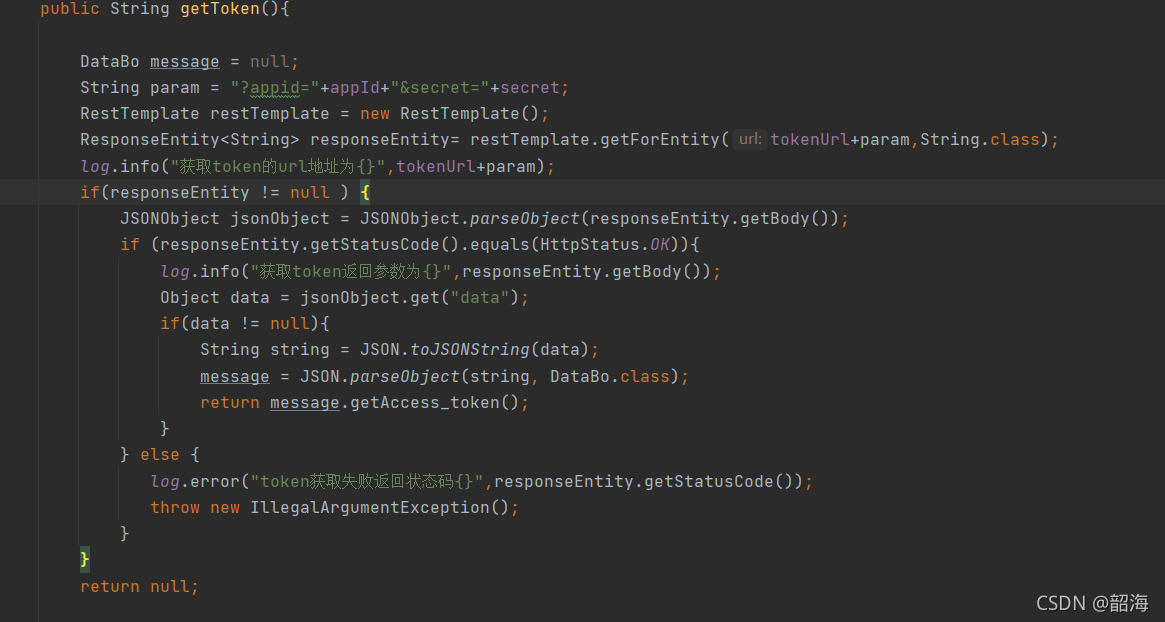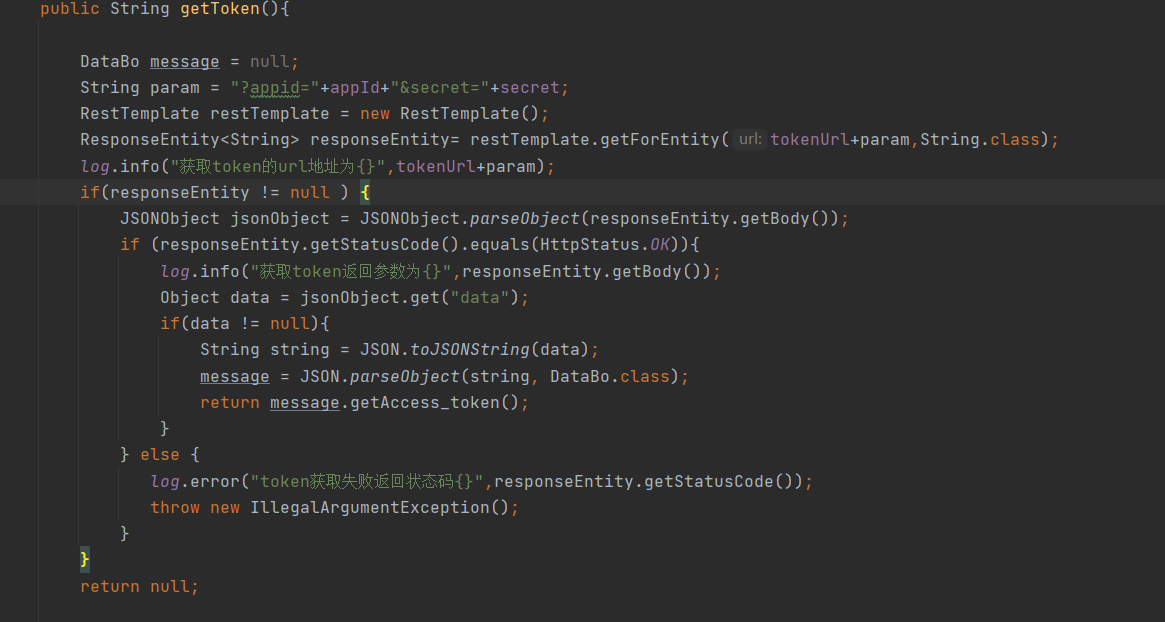 我们将获取token的url拼接好之后,调用restTemplate的get请求去请求第三方接口,其中参数传一个第三方的url,和响应类型(一般为string)此时返回的是ResponseEntity类型的返回值,此返回值中包含了我们需要的数据,请求头和请求状态各种信息。