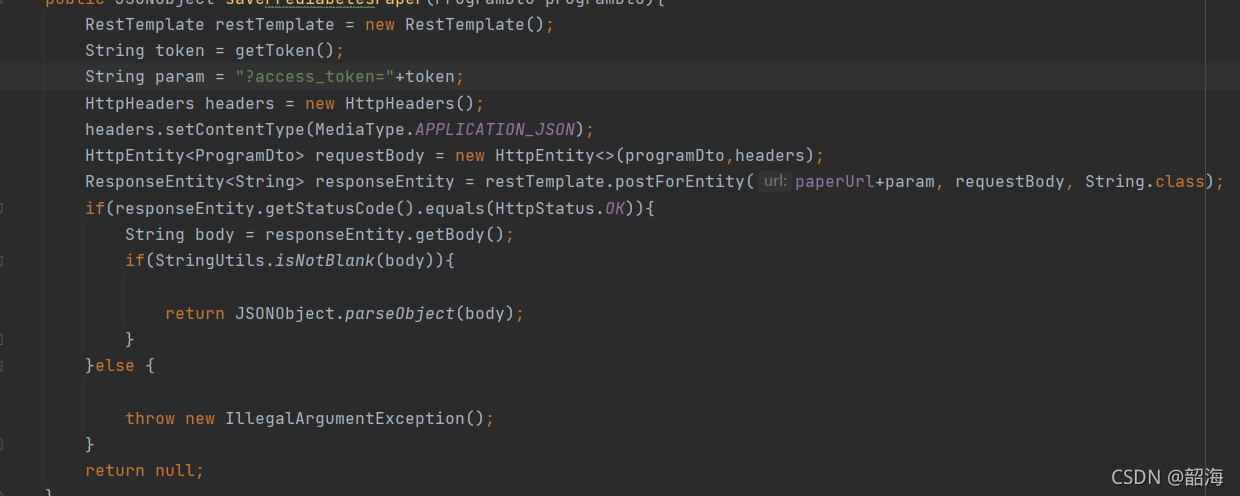 最近在做公司项目时,需要调用合作方的接口,当时自己用的是HttpClient来进行访问,但公司技术大佬看到之后笑笑说 小伙子啊 现在大家都用restTemplate来进行第三方接口的访问,你看你这HttpClient写了一大堆,不够雅观啊。看了看自己那一大堆代码是不够优雅,自己就改进了如下