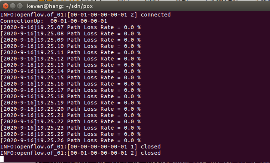 观察 pox 侧的实时状态更新平均丢包率为 0,结果符合 Mininet 脚本中设置的损耗率,也有可能出现负值,可以认为没有丢包。