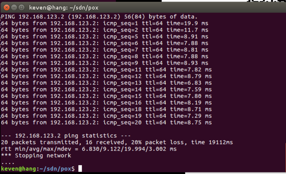 POX 端重新测试,会发现出现丢包现象,但是实际测量出的丢包率会有浮动,链路的性能总体受到了限制。