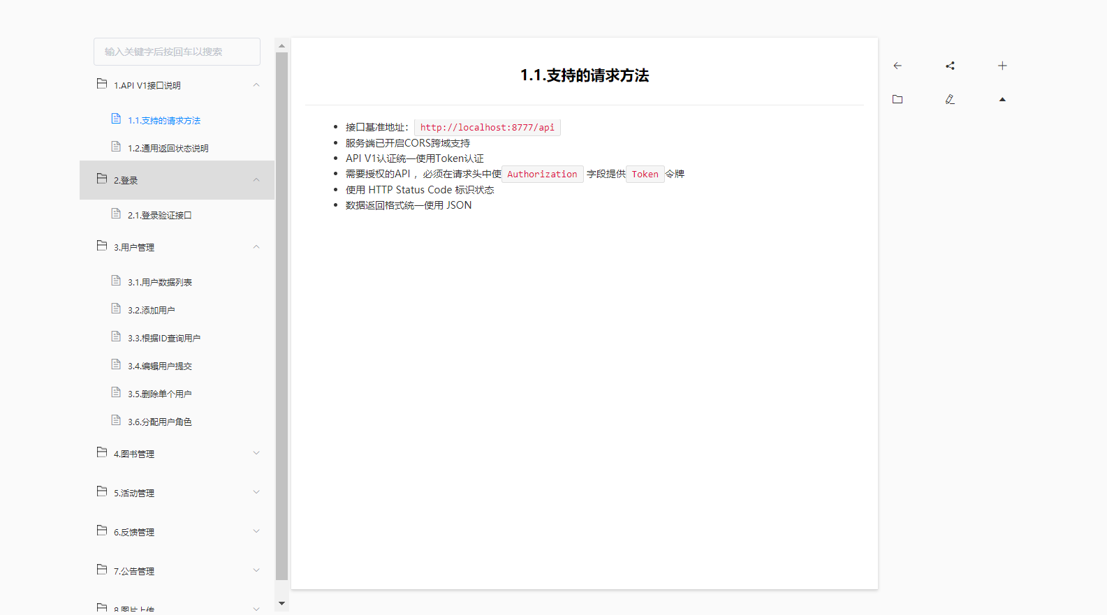 现阶段主要开发任务为前端系统,后端API和系统架构有关,API文档部分已经完成,以下为截图: