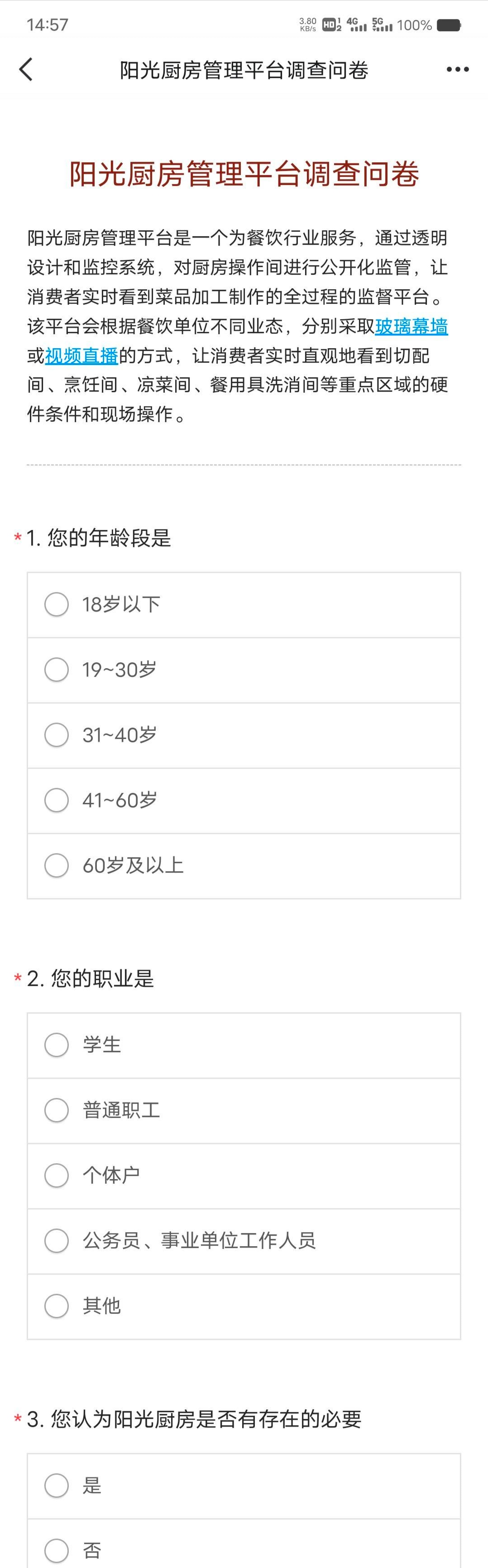 从调查问卷的结果上看,平台使用者的主要需求是通过查看监控来评估厨房的卫生环境是否满足食品卫生需求。