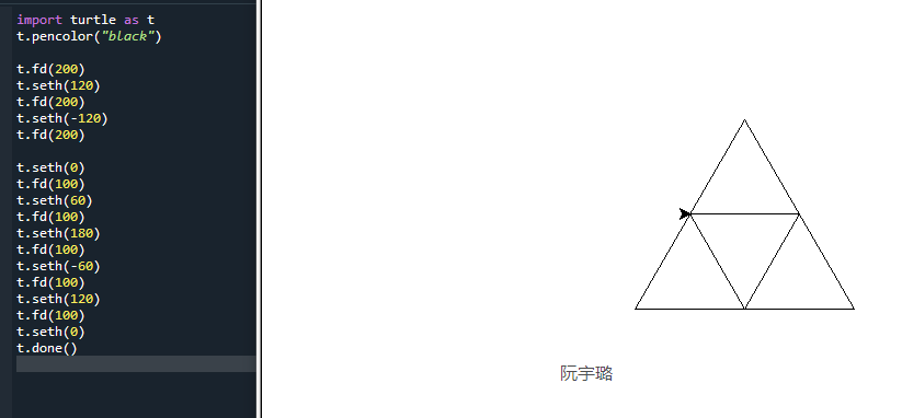 import turtle as t t.pencolor("black") t.fd(200) t.seth(120) t.fd(200) t.seth(-120) t.fd(200) t.seth(0) t.fd(100) t.seth(60) t.fd(100) t.seth(180) t.fd(100) t.seth(-60) t.fd(100) t.seth(120) t.fd(100) t.seth(0) t.done()