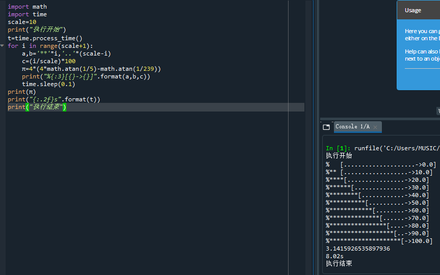 import math import time scale=10 print("执行开始") t=time.process_time() for i in range(scale+1): a,b='**'*i,'..'*(scale-i) c=(i/scale)*100 π=4*(4*math.atan(1/5)-math.atan(1/239)) print("%{:3}[{}->{}]".format(a,b,c)) time.sleep(0.1) print(π) print("{:.2f}s".format(t)) print("执行结束")