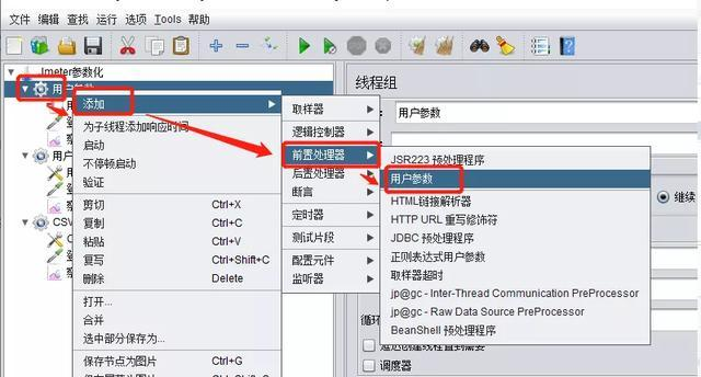 2.操作步骤:右击(如测试计划、线程组、http请求等)> 添加 > 前置处理器 > 用户参数