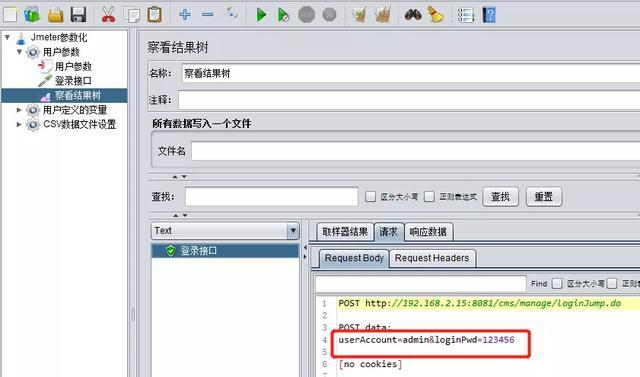由于在【用户参数】中添加了两组数据,而线程组中的线程数只设置了1个,那么执行登录接口的时候取的值为第一组数据(admin/123456)。