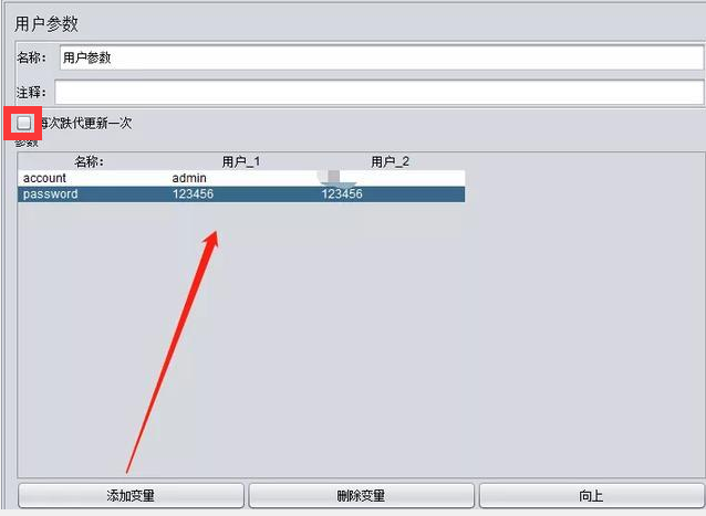3.设置参数:通过【添加变量】添加 account 和password两个变量,注意勾选每次迭代更新一次,否则每次都使用同样的数据