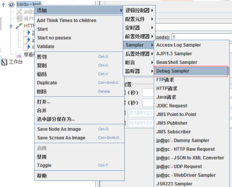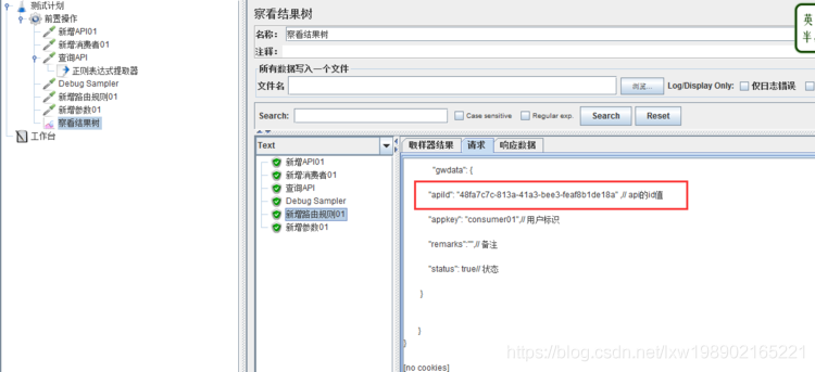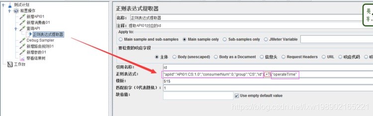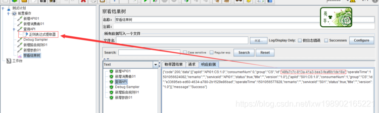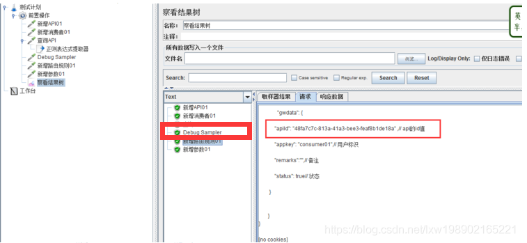 正则表达式自己认为是没问题的,可是就是跑起来有问题,百思不得其解,究竟是数据问题还是表达式的问题,有一个“神器”-----Debug Sampler,什么都不用填写,直接在【查看结果】