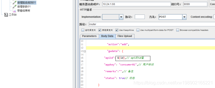 4)、点击http请求完成对接口的定义,下面就可以通过参数${id}来获取内容了,其中id就是方才添加的正则表达式的引用名称