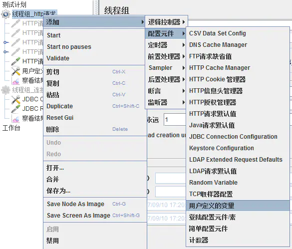 1)、方法一:测试计划-->添加-->配置元件-->用户定义的变量