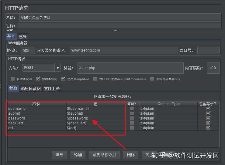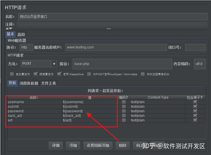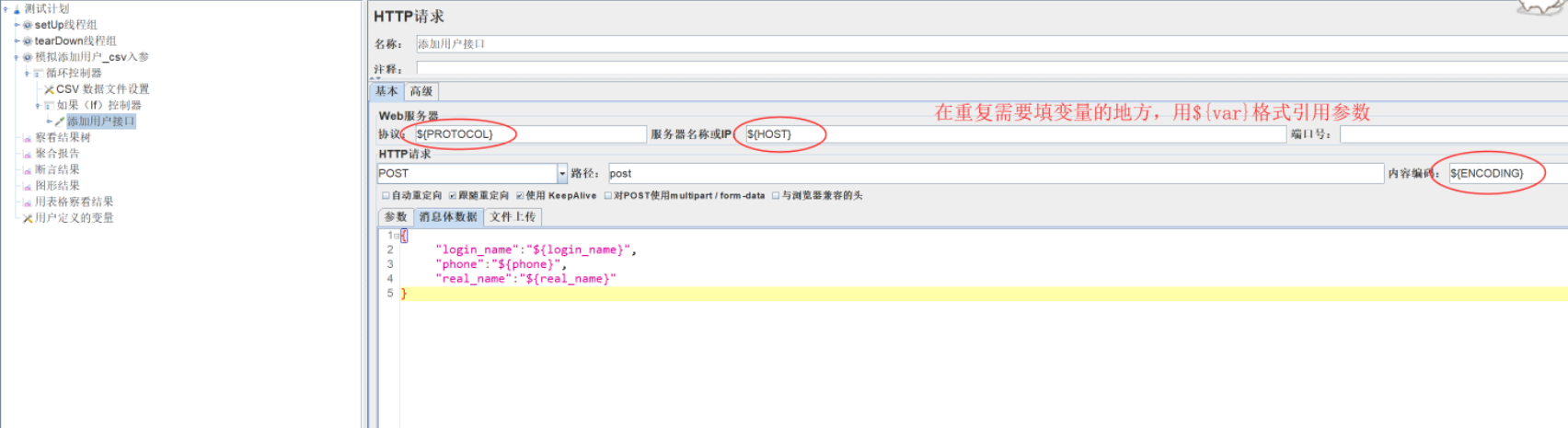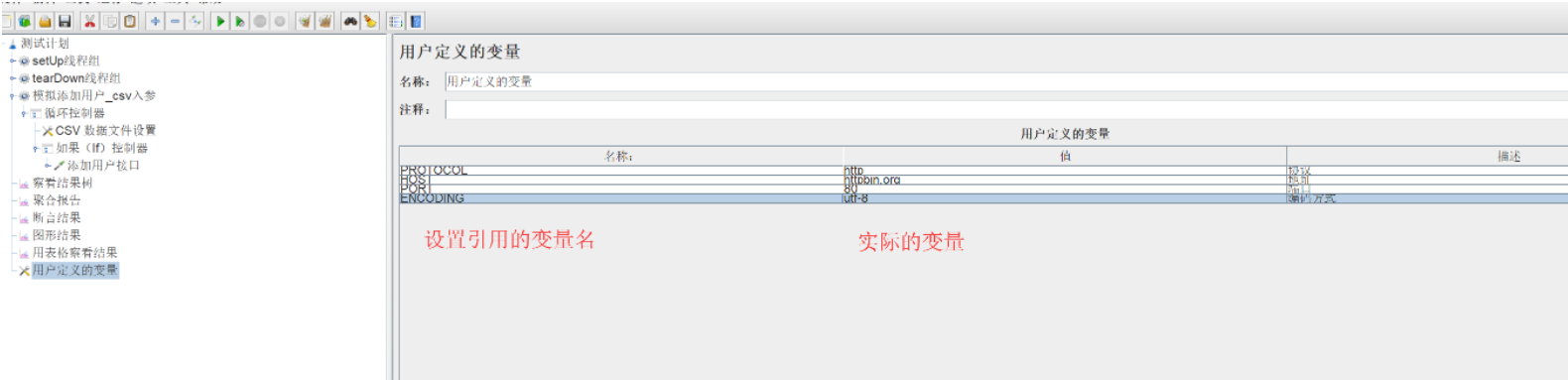 和在“HTTP请求”组件中添加数据的操作一样,这样在该测试计划中的所有组件都可以使用这些变量。
