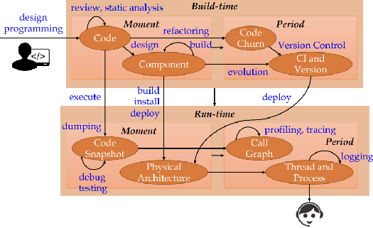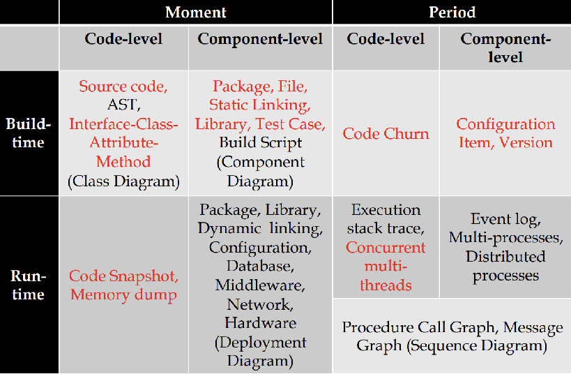 1.构建时:Moment code level:源代码,类,代码的逻辑组织 Moment component level:包,文件,静态链接,库 测试项,配置项,版本。 Period code level 代码变化 Period code levell配置项,版本随时间的变化。