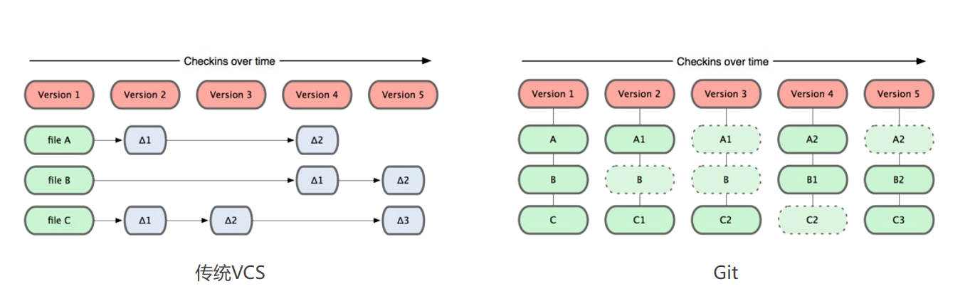 传统 VCS 和 Git 对比 传统 VCS:存储版本之间的变化(行) Git:存储发生变化的文件(而非代码行), 不变化的文件不重复存储